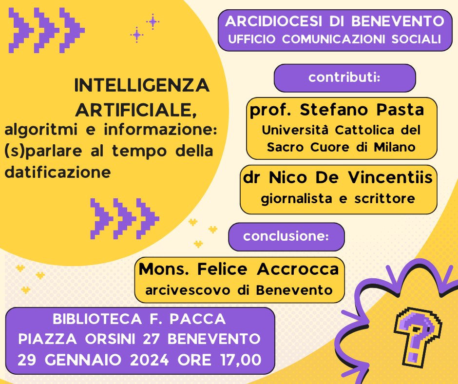L’Ufficio diocesano per le Comunicazioni sociali dell’Arcidiocesi di Benevento organizza un convegno dal titolo: “Intelligenza artificiale, algoritmi e informazione: (s)parlare al tempo della datificazione”. Il convegno si terrà lunedì 29 gennaio 2024 alle ore 17 nella pubblica biblioteca “Francesco Pacca” in piazza Orsini 27, Benevento; interverranno il prof. Stefano Pasta, dell’Università Cattolica del Sacro Cuore di Milano dove tiene diversi corsi tra i quali metodologia delle attività formative e speciali, didattica e tecnologie dell’Istruzione; il giornalista e scrittore Nico De Vincentiis. Le conclusioni saranno di mons. Felice Accrocca arcivescovo di Benevento. La platea immaginata per questa manifestazione è composta non solo dagli operatori della comunicazione, ma da tutti coloro che desiderano prendere consapevolezza delle potenzialità e dei limiti di queste tecnologie, insegnanti e formatori in primis e da coloro che non vogliono rimanere semplici spettatori di processi sempre più pervasivi della realtà quotidiana.