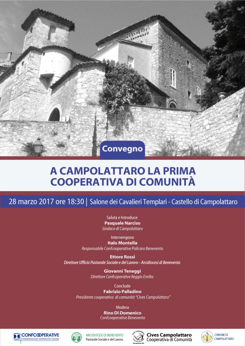 Il primo appuntamento è per il 28 alle ore 18.30 al Salone dei Cavalieri Templari di Campolattaro, comune della provincia di Benevento in cui è nata “CIVES Campolattaro”, la prima cooperativa di comunità. Saluta e introduce Pasquale Narciso, sindaco di Campolattaro. Intervengono: Italo Montella, responsabile Confcooperative Policoro Benevento; Ettore Rossi, direttore Ufficio Pastorale Sociale e del Lavoro; Giovanni Teneggi, di Confcooperative nazionale. Conclude Fabrizio Palladino, presidente della coooperative Cives Campolattaro. Modera Rino Di Domenico, di Confcooperative Benevento.