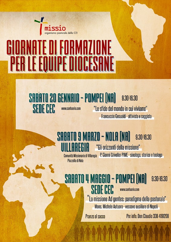 La Commissione Missionaria Regionale ha programmato un corso di formazione per i direttori e collaboratori laici. L’invito è rivolto ai Vicari Foranei che possono comunicare i nominativi dei partecipanti al direttore diocesano dell’Ufficio missionario mons. Aurelio Capone.