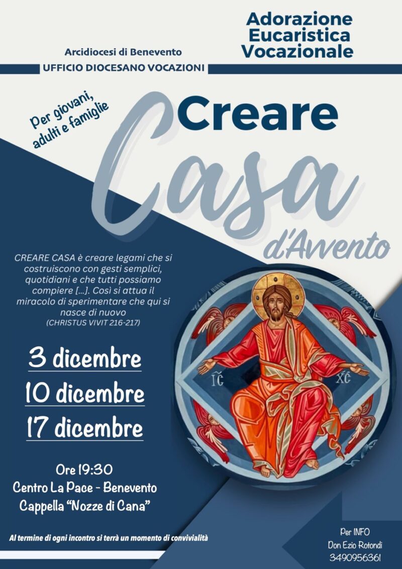 L’Ufficio diocesano Vocazioni di Benevento, diretto da don Ezio Rotondi, ha programmato tre incontri di adorazione eucaristica vocazionale dal titolo: “Creare casa d’Avvento”. Gli incontri si terranno il 3, 10 e 17 dicembre 2023 alle ore 19,30 al Centro la Pace di Benevento.