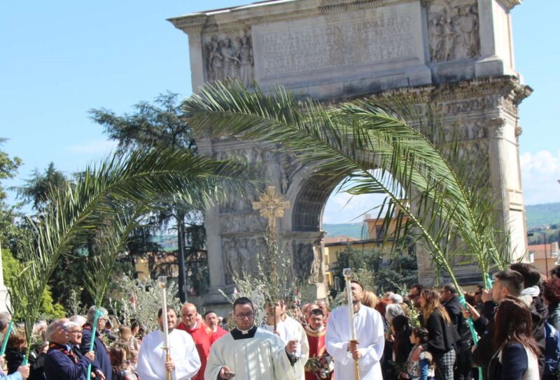 La settimana che inizia con la domenica delle Palme, viene definita santa, perché in essa, non solo si ricordano, ma si celebrano i grandi misteri della Redenzione. Le celebrazioni liturgiche più sentite dai fedeli beneventani sono senz’altro quelle legate a questa settimana, che fa memoria annuale del vertice della vita di Cristo cioè della passione e resurrezione. L’arcivescovo, monsignore Felice Accrocca, domenica 24 marzo, alle ore 10.30 , benedirà le palme all’Arco di Traiano; segue la processione lungo corso Garibaldi e la santa messa in Cattedrale. La solenne messa della passione del Signore sarà presieduta dall’Arcivescovo e concelebrata dai sacerdoti dell’Unità Pastorale “San Filippo Neri” di Benevento.