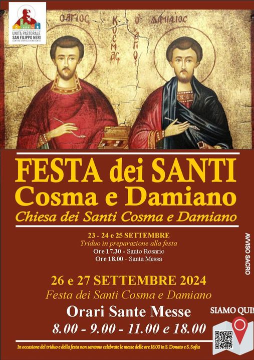 Come da antica tradizione, saranno tanti i fedeli e i devoti che si recheranno presso la piccola chiesa dedicata ai Santi Medici che si trova nei pressi del Ponte Leproso a Benevento, nei giorni dedicati a San Cosma e Damiano, il 26 e 27 settembre. In preparazione alla festa, da lunedì 23 a mercoledì 25, si terrà il triduo in onore dei due Santi: Santo Rosario alle ore 17,30 e Santa Messa alle ore 18. Nei giorni 26 e 27 settembre, le celebrazioni eucaristiche ci saranno alle ore 8, 9, 11 e in serata alle ore 18. Giovedì 26, la Santa Messa delle ore 18 sarà presieduta da Mons. Felice Accrocca, Arcivescovo di Benevento. Ad animare tutti i momenti liturgici della festa dei Santi Cosma e Damiano, sarà la comunità dell’Unità pastorale San Filippo Neri, nel cui territorio ricade la chiesetta dedicata ai Santi Medici.