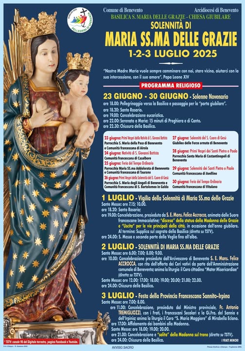 La città di Benevento e l’intero Sannio si preparono a celebrare la Festa della Madonna delle Grazie, e ad accompagnarla nella sua “uscita” il 1° luglio sera. Sul manifesto allegato tutto il programma liturgico…