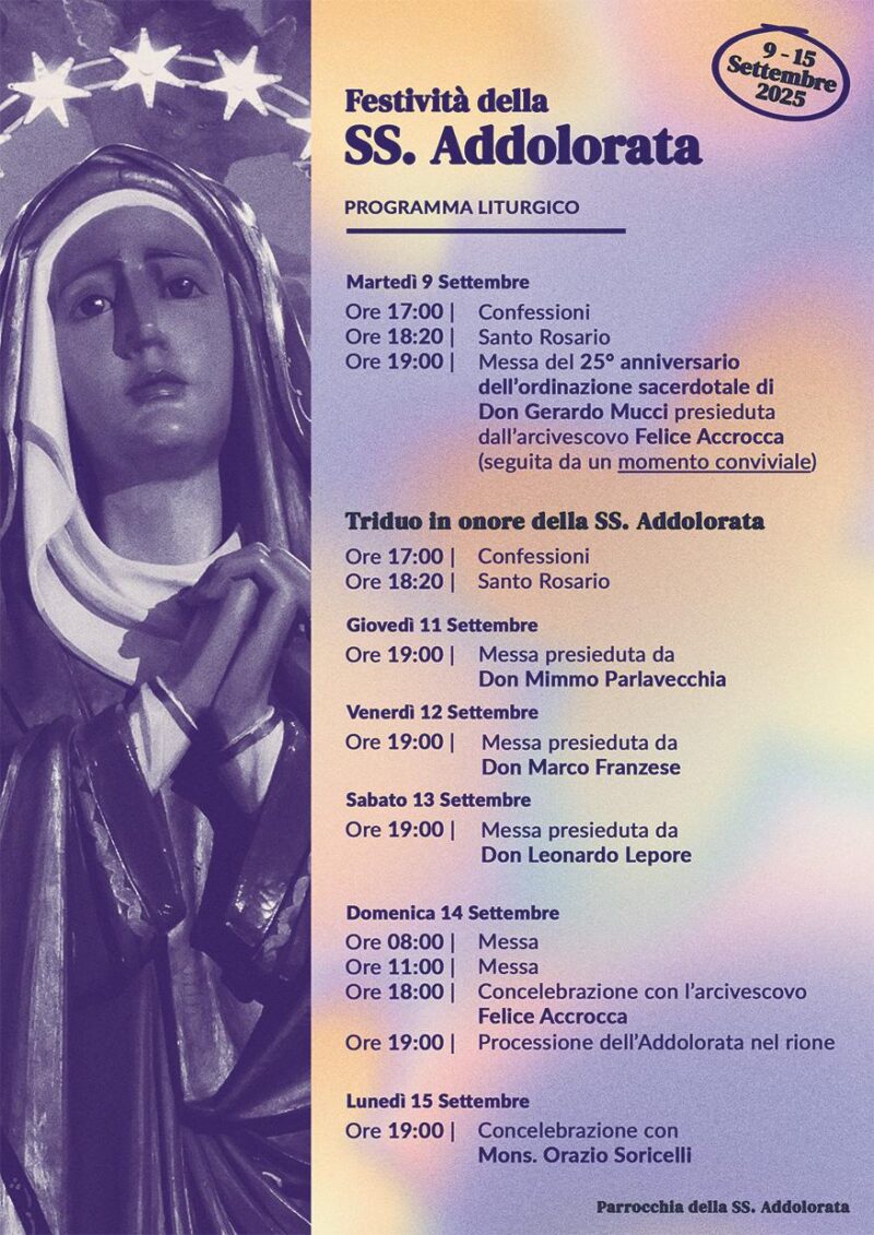 La Parrocchia della Santissima Addolorata in Benevento è lieta di annunciare la Festa Patronale che si terrà dal 12 al 15 settembre 2025. L’evento rappresenta un momento importante per la comunità locale, sia dal punto di vista liturgico che come occasione di aggregazione e socialità. I festeggiamenti inizieranno martedì 9 settembre con una Santa Messa in ricordo di Don Gerardo Mucci, scomparso nel 2017, a cui seguirà un momento conviviale con l’intera comunità.