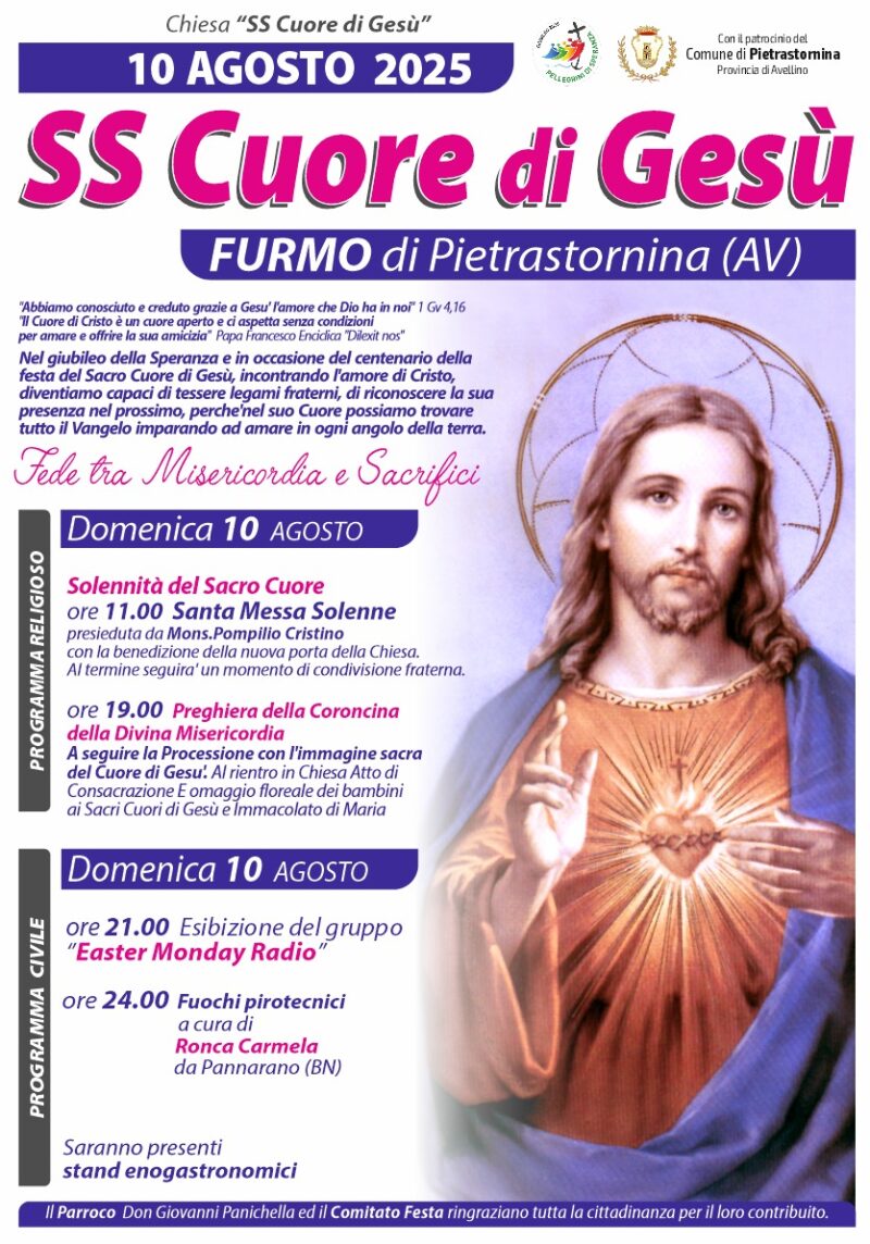Furmo di Pietrastornina festeggia il Sacro Cuore Furmo di Pietrastornina festeggia il il 10 agosto 2025 il Sacro Cuore. Per il programma vedi il manifesto…
