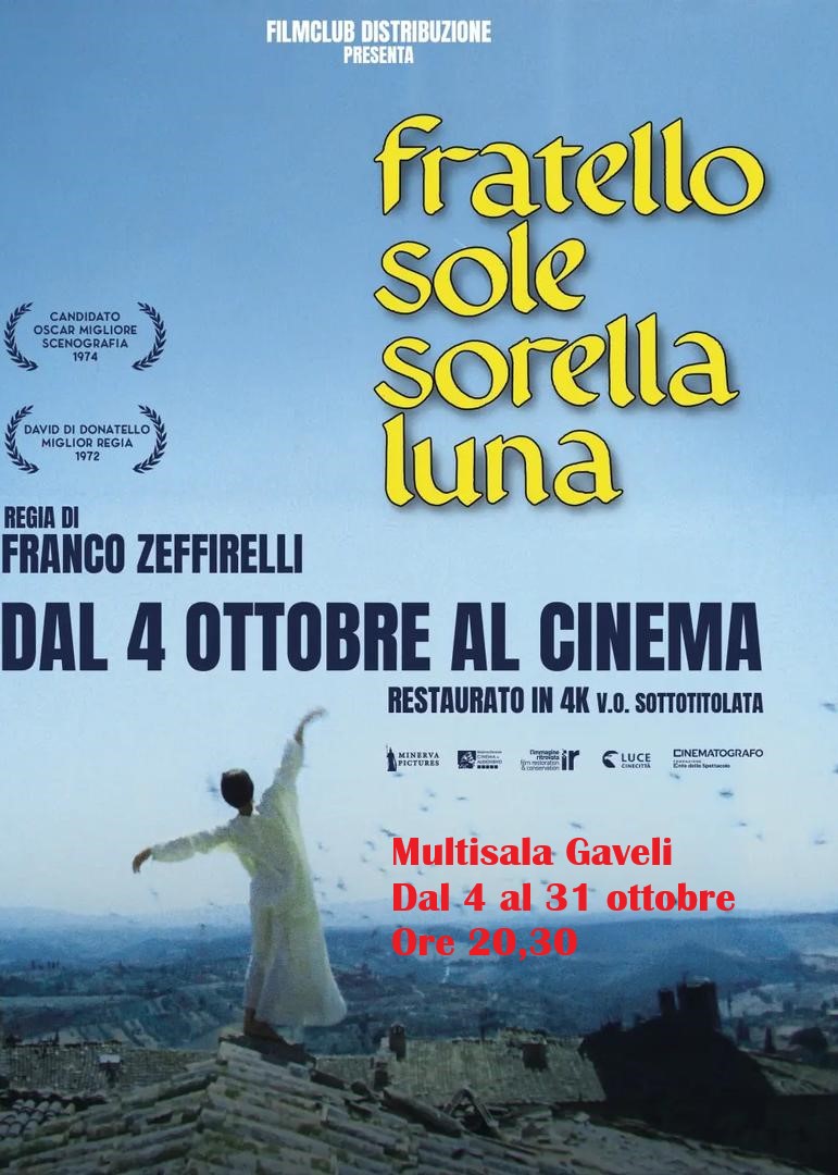 Il 4 ottobre 2024, e a seguire per tutto il mese francescano, il capolavoro senza tempo di Franco Zeffirelli “Fratello Sole Sorella Luna” farà il suo ritorno sul grande schermo. Si tratta di una nuovissima versione restaurata in 4K, riportando il pubblico alle origini di una delle più belle celebrazioni cinematografiche della vita di San Francesco d’Assisi, proprio nel giorno dedicato al Santo Patrono di Italia. La proiezione di questo capolavoro del maestro Zeffirelli, sarà proposta anche a Benevento, presso la Multisala Gaveli di contrada Piano Cappelle. Dal 4 al 31 ottobre, “Fratello Sole Sorella Luna” sarà proiettato tutti i giorni alle ore 20.30.
