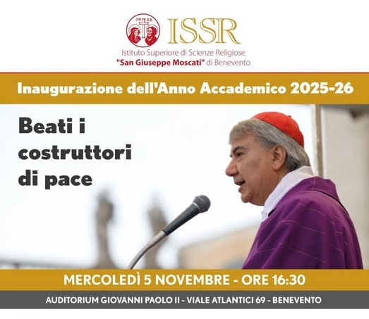 Si terrà mercoledì 5 novembre 2025 presso il seminario arcivescovile, a partire dalle ore 16,30, la cerimonia di inaugurazione dell’a.a. 2025-26 dell’Istituto Superiore di Scienze Religiose “San Giuseppe Moscati” con sede in Benevento. Porteranno i saluti mons. Felice Accrocca, arcivescovo metropolita di Benevento, moderatore ISSR “San Giuseppe Moscati”; don prof. Francesco Asti, preside della Pontificia Facoltà Teologica dell’Italia Meridionale di Napoli; introduce don prof. Giovanni Tagliaferro, direttore dell’istituto Superiore di Scienze Religiose “San Giuseppe Moscati”. La lectio sul tema: “Beati i costruttori di pace” sarà tenuta dal cardinale Domenico Battaglia, arcivescovo di Napoli e gran cancelliere della Pontificia Facoltà Teologica dell’Italia Meridionale di Napoli.