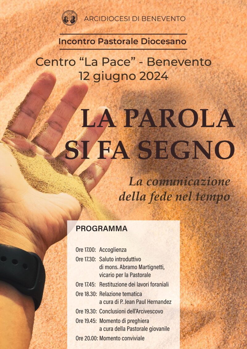 L’incontro pastorale diocesano si terrà quest’anno il 12 giugno 2024 al Centro “La Pace” di Benevento con il titolo: “La Parola si fa segno” La comunicazione della fede nel tempo. Il programma prevede alle ore 17 l’accoglienza dei partecipanti; alle ore 17,30 il saluto introduttivo di mons. Abramo Martignetti, vicario per la Pastorale; alle ore 17,45 la presentazione dei lavori foraniali; alle ore 18,30 la relazione tematica a cura di P. Jean Paul Hernandez; alle ore 19,30 le conclusioni dell’arcivescovo mons. Felice Accrocca; alle ore 19,45 la preghiera a cura della Pastorale giovanile a seguire un momento conviviale.