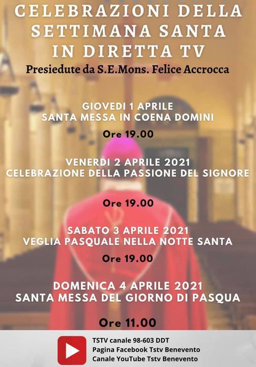 L’Ufficio liturgico della diocesi comunica il calendario delle celebrazioni, che saranno presiedute in Cattedrale dall’arcivescovo mons. Felice Accrocca e trasmesse in diretta dall’emittente Telesperanza canale 98 e 603 del digitale terrestre oltre che sul canale youtube e sulla pagina facebook dell’emittente.