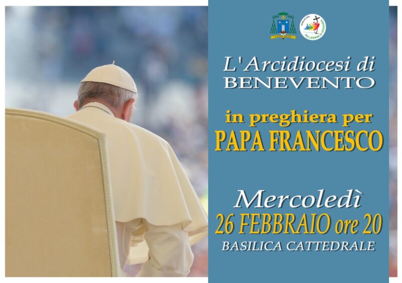 La perdurante situazione di complessità di salute di Papa Francesco, dagli esiti ancora incerti, chiama tutti a un’intensa preghiera: invito, perciò, la comunità diocesana a unirsi al coro che sale da tutta la Chiesa, mercoledì 26 febbraio, nell’ora che le singole comunità ritengono per esse più idonea. I parroci e i fedeli della città di Benevento si ritroveranno con me nella Basilica Cattedrale alle ore 20.