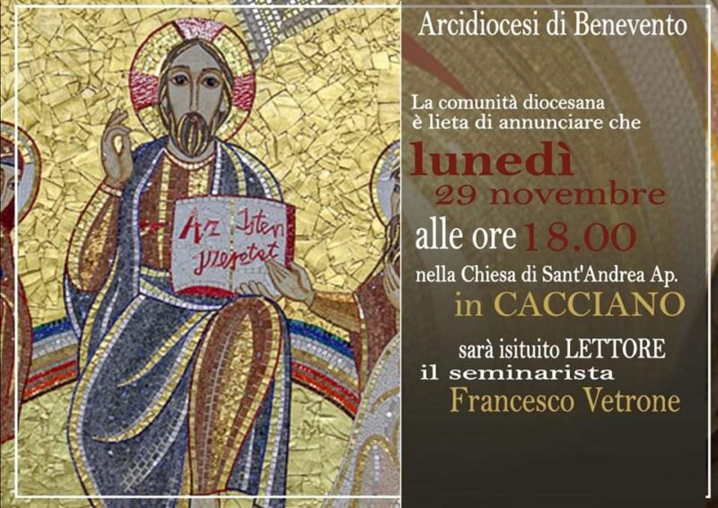 Lettorato al seminarista Francesco Vetrone La comunità diocesana è lieta di annunciare che lunedì 29 novembre, alle ore 18 nella chiesa S. Andrea Apostolo in Cacciano, sarà istituito lettore il seminarista Francesco Vetrone.