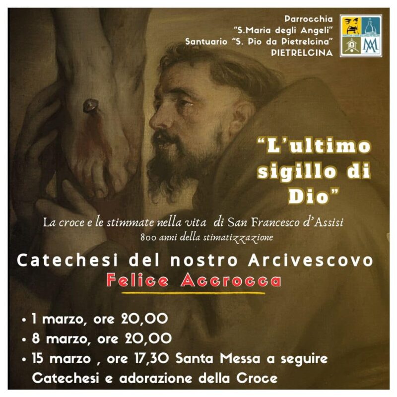 “L’ultimo sigillo di Dio” tre catechesi dell’arcivescovo mons. Felice Accrocca a Pietrelcina nel Santuario “S. Pio da Pietrelcina” . La croce e le stimmate nella vita di San Francesco d’Assisi 800 anni della stimatizzazione questa la tematica che sarà affrontata da mons. Accrocca il 1° marzo alle ore 20; l’8 marzo alle ore 20 e il 15 marzo, ore 17,30 santa messa a seguire catechesi e adorazione della croce.