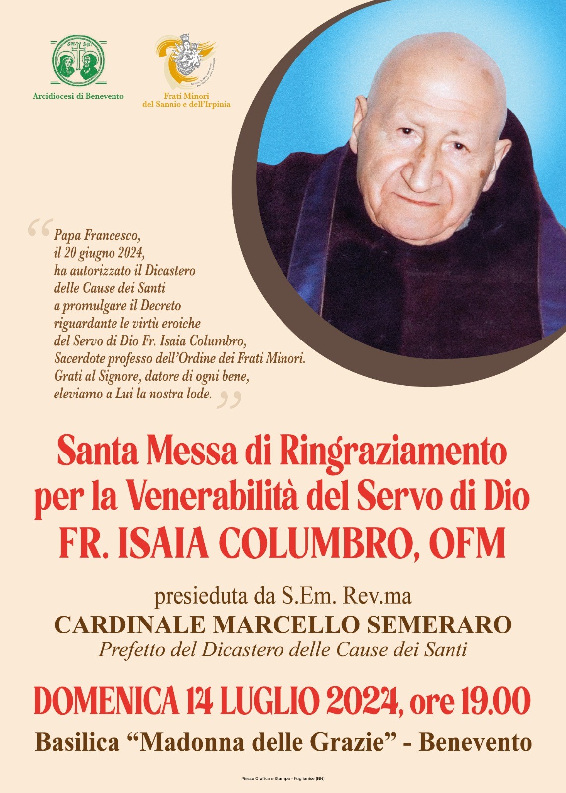 Domenica prossima 14 luglio 2024, alle ore 19.00, nella Basilica della Madonna delle Grazie di Benevento sarà celebrata la Solenne Santa Messa di ringraziamento per la Venerabilità di Fr. Isaia Columbro, presieduta da S.Em. il Cardinale Marcello Semeraro, Prefetto del Dicastero delle Cause dei Santi.