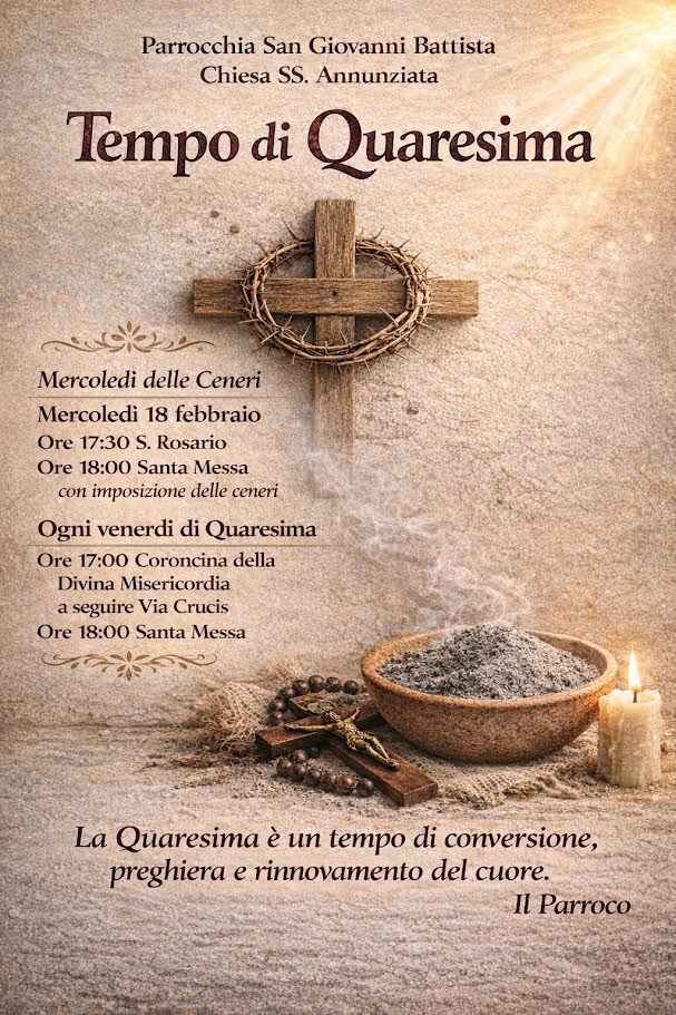 Montesarchio: il programma della Quaresima 2026 La Parrocchia di San Giovanni Battista in Montesarchio ha stilato il programma per la Quaresima 2026. Vedi il manifesto…
