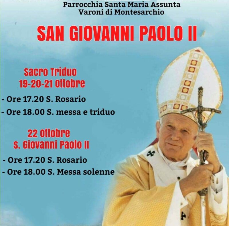 Montesarchio: triduo per San Giovanni Paolo II La parrocchia Santa Maria Assunta in Varoni di Montesarchio in preghiera per San Giovanni Paolo II. Dal 19 ottobre triduo e santo rosario. Per il programma vedi il manifesto…
