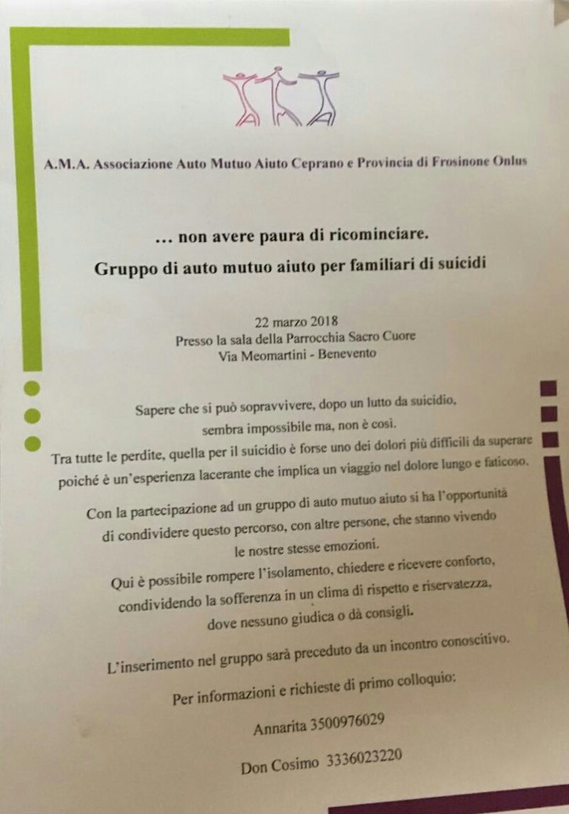 Nasce anche a Benevento il gruppo di auto mutuo aiuto per familiari di suicidi. Il gruppo sarà presentato giovedì 22 marzo alle ore 18 da don Cosimo Cavalluzzo e Annarita Del Grosso presso la sala della parrocchia Sacro Cuore in Benevento.