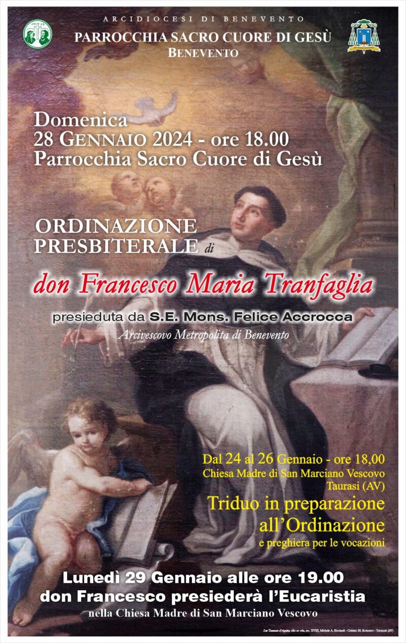 La Santa Chiesa di Dio che è in Benevento annuncia con gioia l’ordinazione presbiterale di don Francesco Maria Tranfaglia per l’imposizione delle mani e la preghiera consacratoria dell’arcivescovo metropolita di Benevento mons. Felice Accrocca Domenica 28 gennaio 2024, alle ore 18, nella parrocchia Sacro Cuore di Gesù in Benevento. Dal 24 al 26 gennaio, alle ore 18, nella chiesa madre di San Marciano Taurasi (Av) triduo in preparazione all’Ordinazione e preghiera per le vocazioni. Lunedì 29 gennaio, alle ore 19, don Francesco presiederà L’Eucaristia nella chiesa madre di Taurasi.