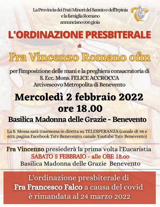 La Provincia dei Frati Minori del Sannio e dell’Irpinia e la famiglia Romano annunciano con gioia l’ordinazione presbiterale di Fra Vincenzo Romano ofm per l’imposizione delle mani e la preghiera consacratoria dell’arcivescovo metropolita di Benevento mons. Felice Accrocca mercoledì 2 febbraio, alle ore 18, nella basilica Madonna delle Grazie di Benevento. La S. Messa sarà trasmessa su Telesperanza (canale dt 98 e 603; pagina facebook Tstv Benevento; canale yotube Tstv Benevento). L’ordinazione presbiterale di Fra Francesco Falco a causa del covid è rimandata al 24 marzo 2022.
