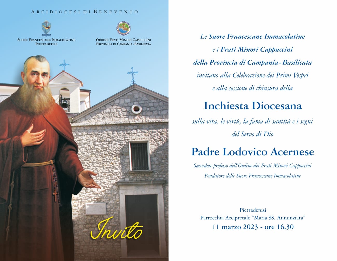 Le suore Francescane Immacolatine e frati Minori Cappuccini della provincia di Campania – Basilicata invitano, per il giorno 11 marzo 2023 alle ore 16,30, alla celebrazione dei primi vespri e alla sessione di chiusura della inchiesta diocesana sulla vita, le virtù, la fama di santità e i segni del Servo di Dio Padre Lodovico Acernese. L’evento religioso si terrà a Pietradefusi (Av) nella parrocchia arcipretale “Maria SS. Annunziata”.