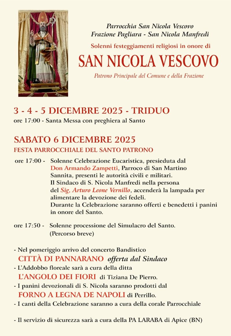 La parrocchia di Pagliara, frazione di San Nicola Manfredi, guidata dal parroco don Antonio Bonavita, festeggia il patrono: San Nicola vescovo. Per il programma vedi il manifesto…