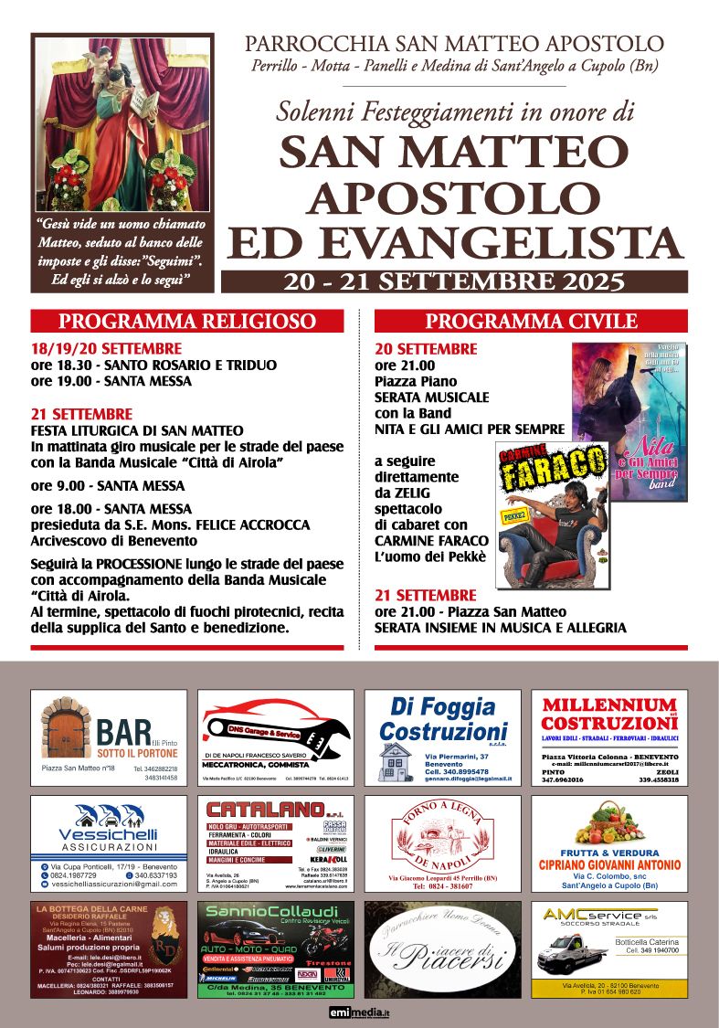 Perrillo festeggia S. Matteo La parrocchia San Matteo apostolo in Perrillo, Motta, Panelli e Medina di Sant’Angelo a Cupolo comunica il programma dei solenni festeggiamenti di San Matteo apostolo il 20 e 21 settembre. Vedi manifesto…