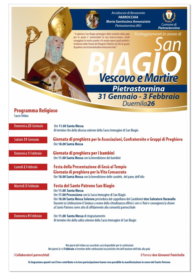 La parrocchia “Maria Santissima Annunziata” Pietrastornina (Av), guidata dal parroco don Giovanni Panichella,  ha organizzato i festeggiamenti religiosi per San Biagio vescovo e martire. Per il programma vedi manifesto…