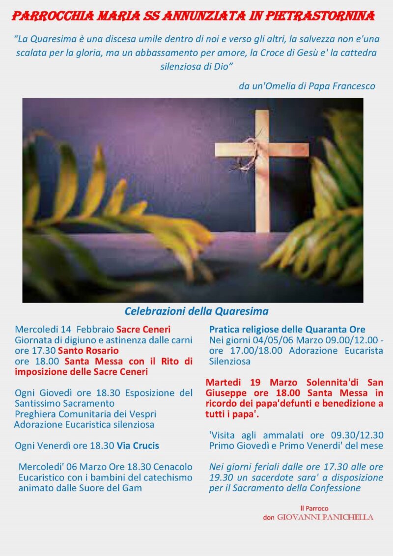 Pietrastornina: il programma della Quaresima Programma delle celebrazioni della Quaresima della Parrocchia “Maria SS. Annunziata” di Pietrastornina. Vedi la locandina…