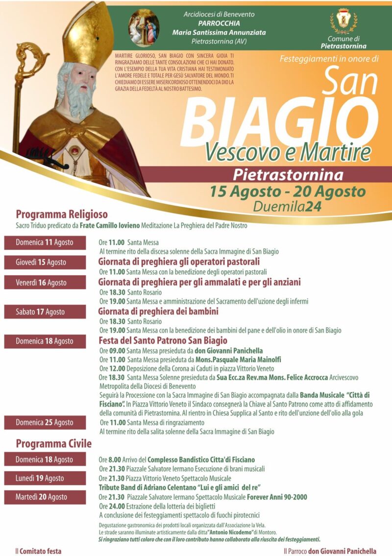 Molto ricco il programma della festa di san Biagio v. e m. che si terrà nella parrocchia di Maria Santissima Annunziata di Pietrastornina (AV) retta da don Giovanni Panichella, dal 15 al 20 agosto 2024. Per Il programma vedi il manifesto…