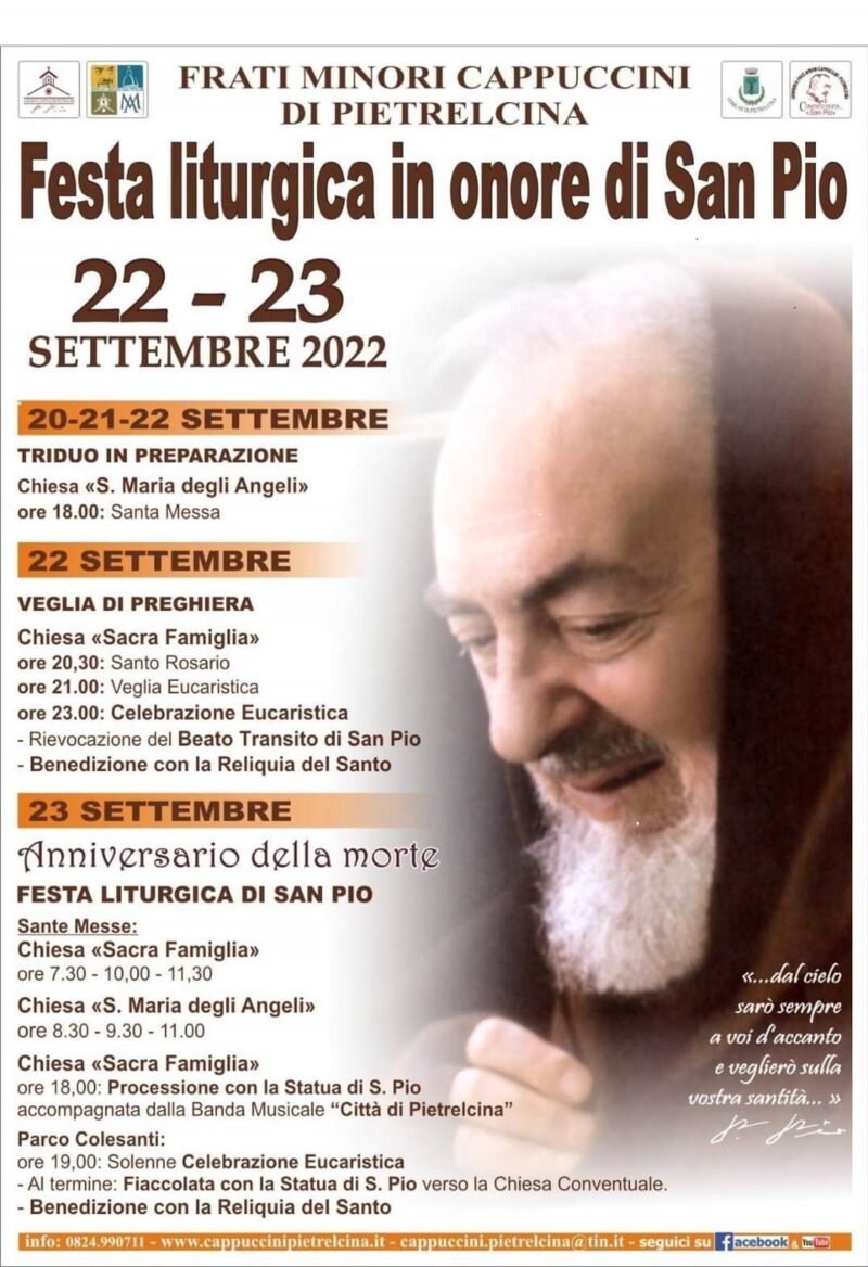 Pietrelcina: festa liturgica in onore di S. Pio I frati minori cappuccini di Pietrelcina hanno programmato per i giorni 20,21, 22 e 23 settembre 2022 i festeggiamenti per S. Pio. Per il programma vedi il manifesto…