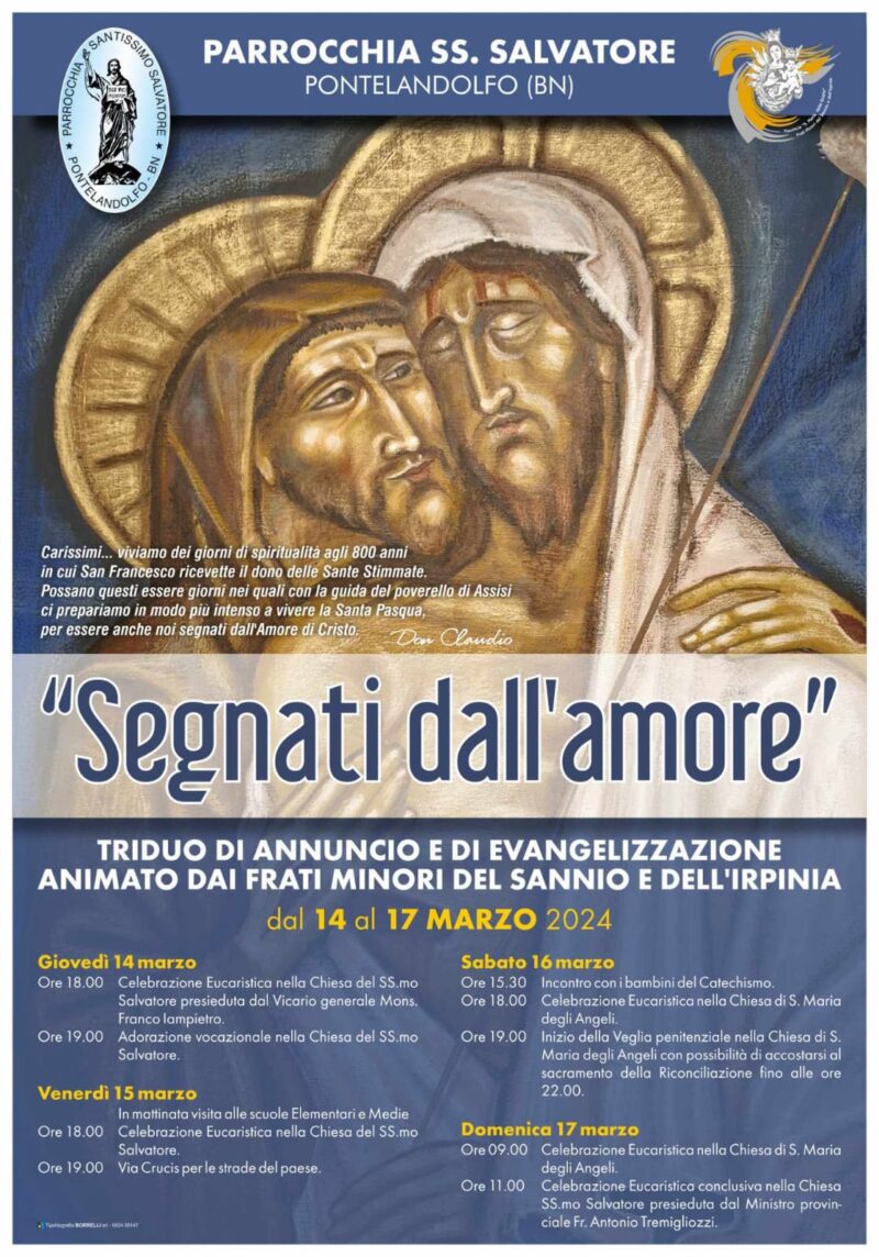 La parrocchia SS. Salvatore di Pontelandolfo ha organizzato un triduo di annuncio e di evangelizzazione dal titolo “Segnati dall’amore”, animato dai frati minori del Sannio e dell’Irpinia. Per il programma vedi il manifesto….