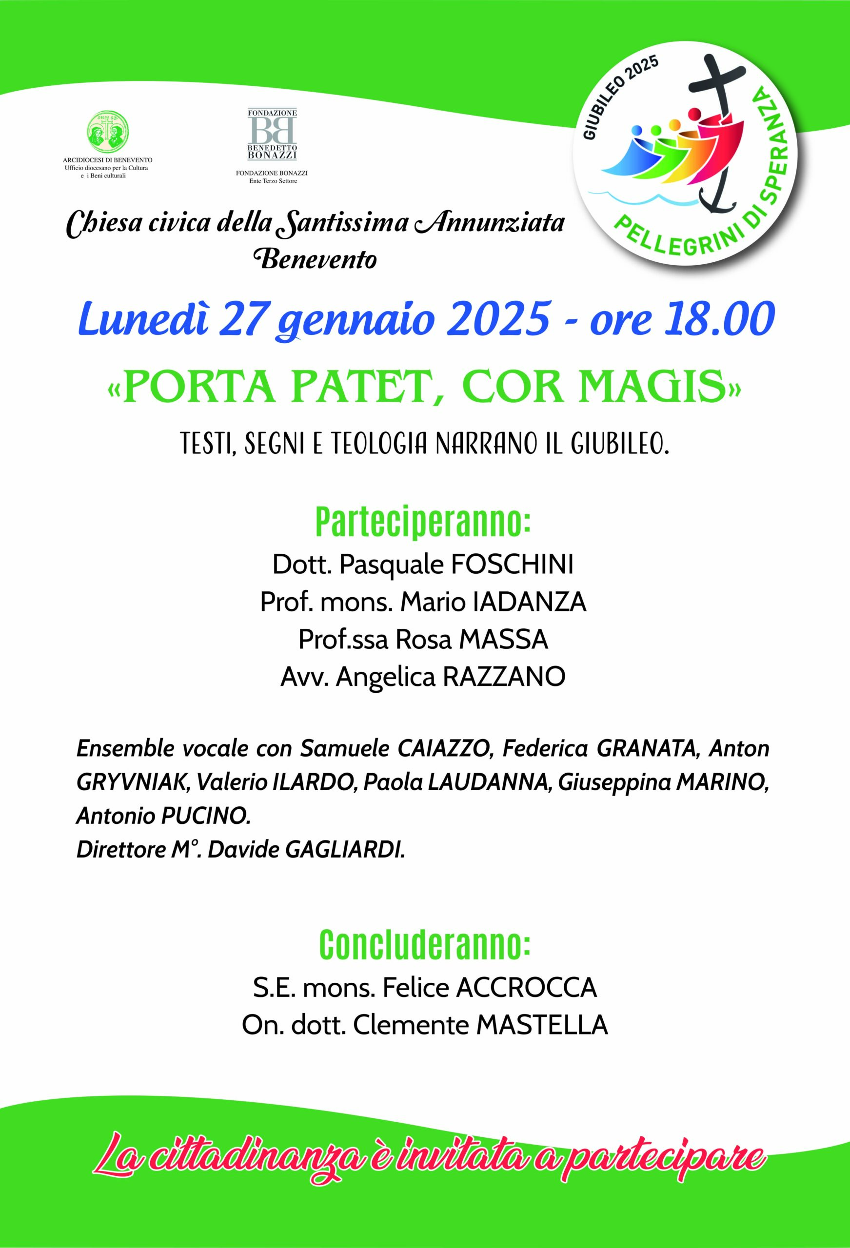 Utile introduzione alla lettura e comprensione dell’evento nei fondamenti biblici, nella storia, nei simboli può essere la manifestazione che si terrà nella chiesa civica della Santissima Annunziata di Benevento lunedì 27 gennaio 2025 dal titolo «Porta patet. Cor magis. Testi, segni e teologia narrano il Giubileo».