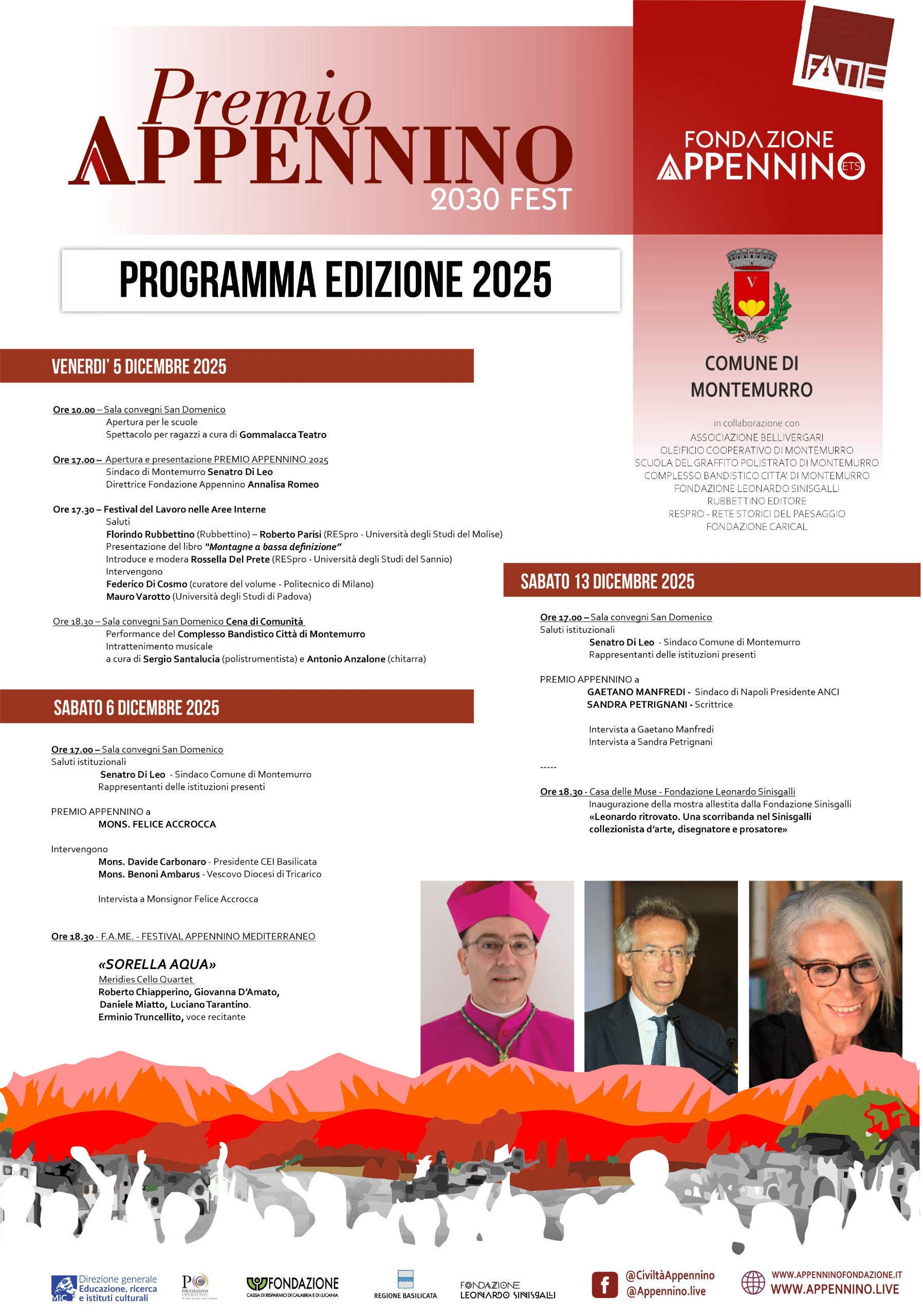 Prende il via a Montemurro in provincia di Potenza la quarta edizione del PREMIO APPENNINO 2030FEST, ideato e realizzato da Fondazione Appennino Ets in collaborazione con l’Amministrazione Comunale. Anche quest’edizione sarà suddivisa in due sessioni, la prima in questo week end – 5 e 6 dicembre – mentre la prossima sarà sabato 13 dicembre 2025.