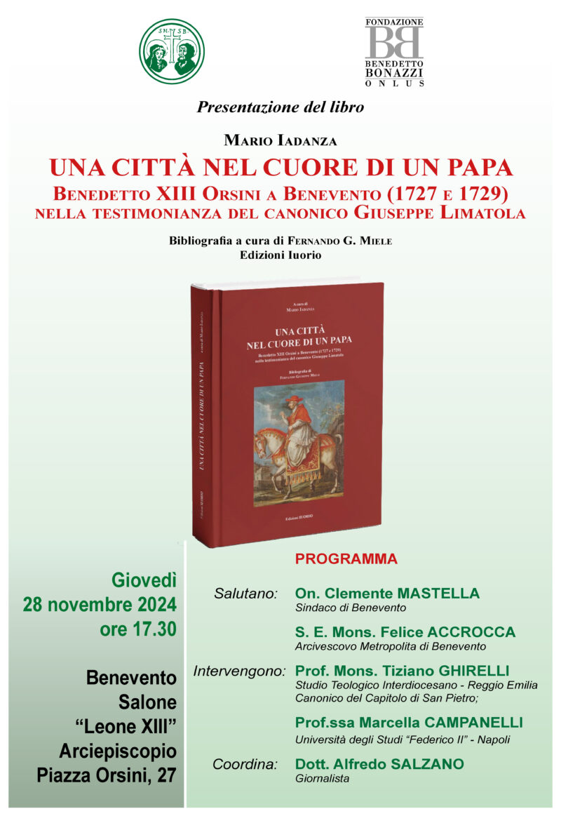 Giovedì 28 novembre 2024, alle ore 17.30 nel Salone “Leone XIII” dell’Arciepiscopio, Piazza Orsini, 27 -Benevento, sarà presentato il libro di Mario Iadanza, Una città nel cuore di un Papa. Benedetto XIII Orsini a Benevento (1727 e 1729) nella testimonianza del canonico Giuseppe Limatola. Bibliografia a cura di Fernando G. Miele, Benevento, Edizioni Grafiche Iuorio, 2024.