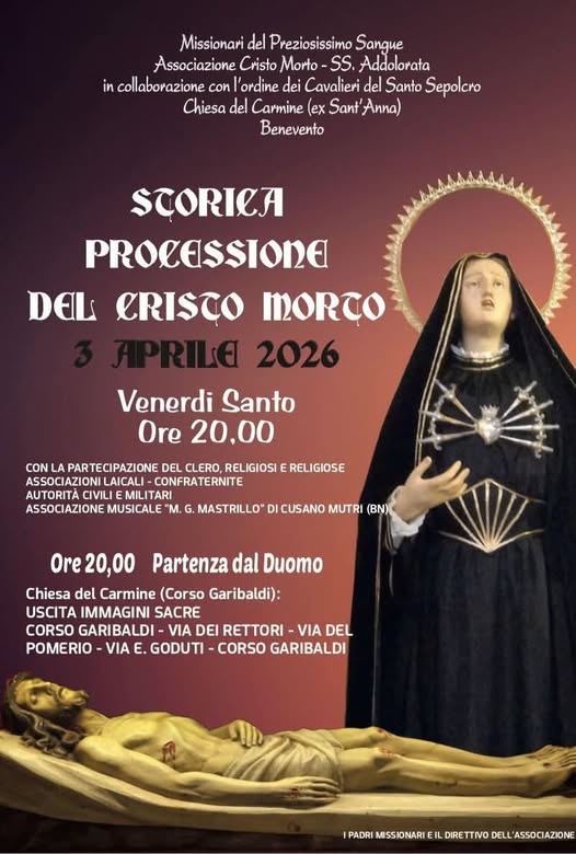 Macchina organizzativa in azione per la tradizionale processione del Cristo morto nel centro storico di Benevento. L’appuntamento, sentitissimo dai beneventani, è in programma il 3 aprile, Venerdì santo, alle ore 20, con partenza dalla Cattedrale, al corso Garibaldi. L’importante manifestazione religiosa è organizzata dalla Congregazione dei Missionari del Preziosissimo Sangue in collaborazione con i Cavalieri del Santo sepolcro . Il corteo partirà dunque dal Duomo e si snoderà lungo corso Garibaldi, arrivando alla chiesa del Carmine ( uscita delle sacre Immagini). La processione percorrerà corso Garibaldi, svolterà su viale dei Rettori e arriverà all’Arco di Traiano. Successivamente il corteo percorrerà via del Pomerio, via Ennio Goduti e, infine, parte di corso Garibaldi per rientrare alla chiesa del Carmine. Come ogni anno, a guidare la processione il clero, le comunità religiose, le associazioni di volontariato, le confraternite e numerose autorità militari e civili. Ad animare ci sarà la banda musicale “M.G. Mastrillo” di Cusano Mutri (BN).