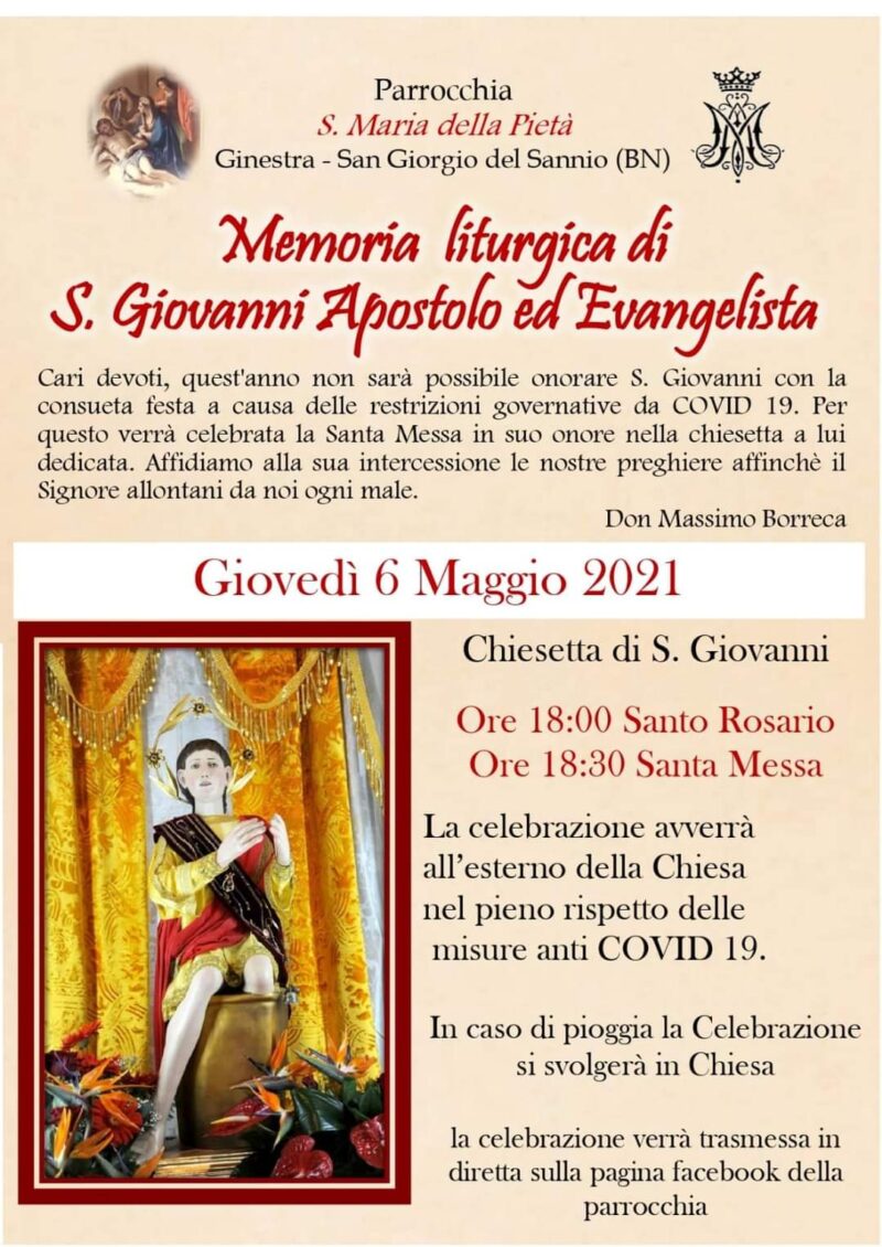 Giovedì 6 maggio alle ore 18,30 nella parrocchia S. Maria della Pietà, santa Messa nella memoria liturgica di San Giovanni apostolo ed Evangelista. Così il parroco don Massimo Borreca: “Cari devoti, quest’anno non sarà possibile onorare S. Marco con la consueta festa a causa delle restrizioni governative da Covid 19. Per questo verrà celebrata la santa messa in suo onore nella chiesetta lui dedicata. Affidiamo alla sua intercessione le nostre preghiere affinché il Signore allontani da noi ogni male”.
