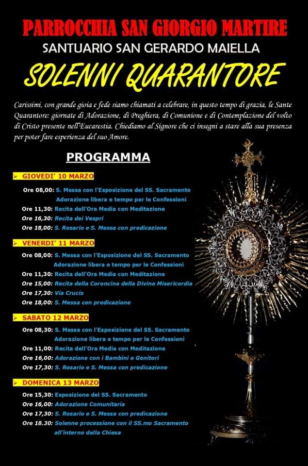 San Giorgio del Sannio: solenni quarantore Nel santuario di San Gerardo Maiella a San Giorgio del Sannio solenni quarantore di preghiera. Per il programma vedi il manifesto…