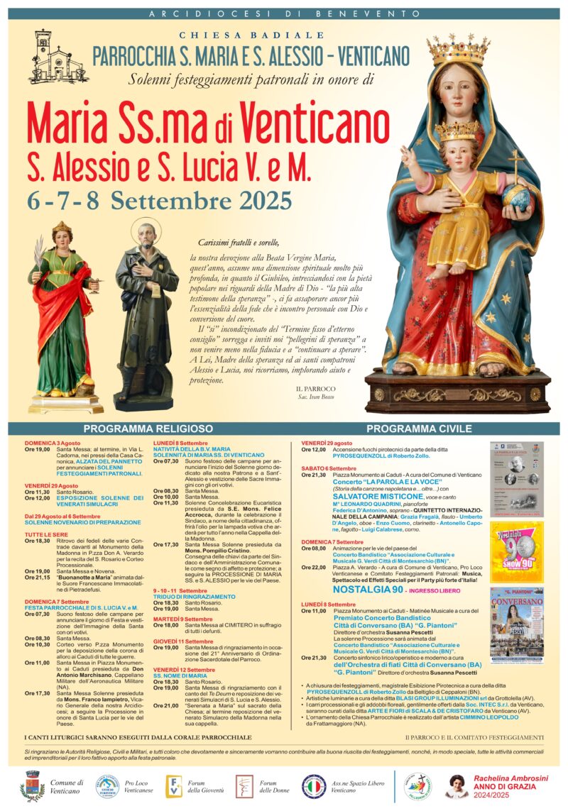 La parrocchia di Santa Maria e S. Alessio in Venticano (Av) ha organizzato i solenni festeggiamenti patronali in onore di Maria Ss.ma, S. Alessio e S. Lucia nei giorni 6-7-8 settembre 2025. Per il programma vedi il manifesto…