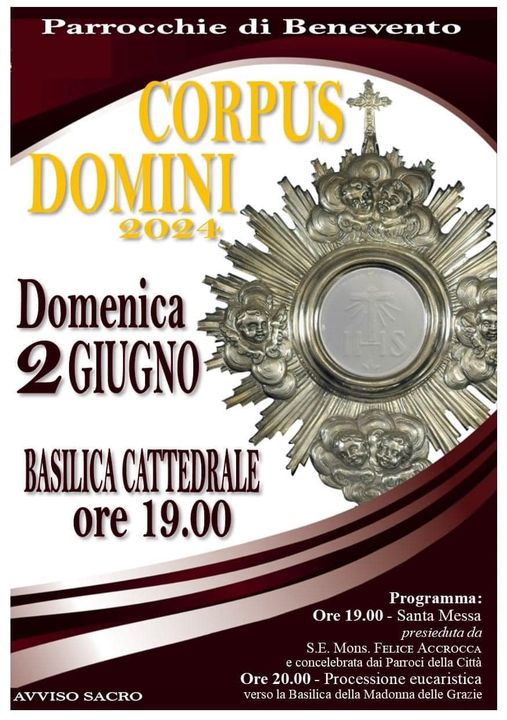 Domenica 2 giugno 2024, in occasione della solennità del Corpus Domini, alle ore 19.00, l’arcivescovo mons. Felice Accrocca, presiederà nella Basilica Cattedrale insieme ai parroci della città di Benevento, la solenne celebrazione eucaristica a cui seguirà la tradizionale processione che partendo dalla Cattedrale raggiungerà la Basilica della Madonna delle Grazie.