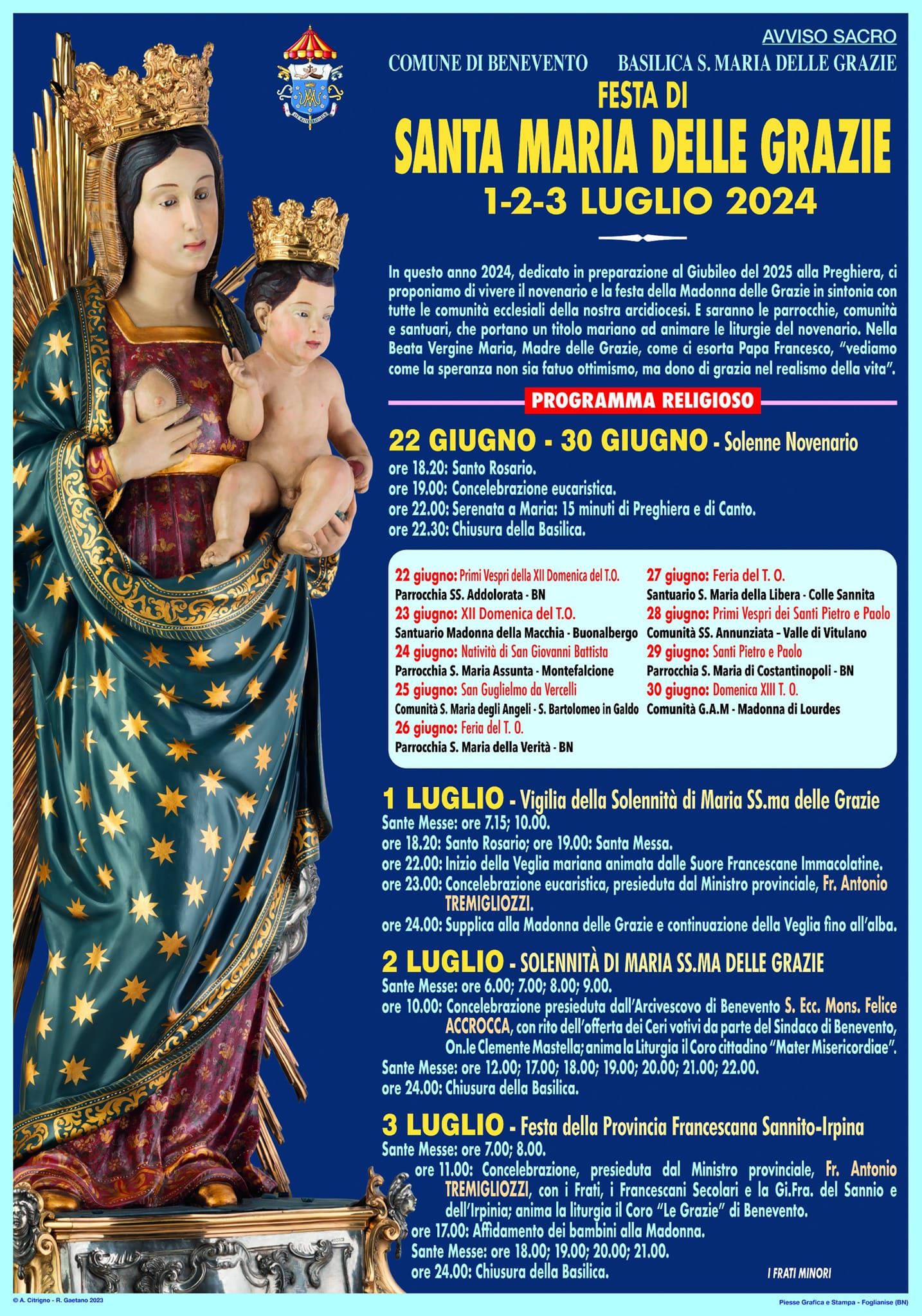 I frati francescani minori che reggono la Basilica della Madonna delle Grazie hanno predisposto il programma religioso per la festa così cara alla città di Benevento. Quest’anno l’animazione liturgica del solenne novenario che inizia il 22 giugno, sarà a cura delle parrocchie e dei santuari che nella diocesi portano un titolo mariano. I momenti più intensi saranno certamente la veglia nella notte tra il 1 e il 2 luglio e, nel giorno della festa, la concelebrazione eucaristica delle 10,00 presieduta dall’arcivescovo di Benevento, mons. Felice Accrocca, durante la quale ci sarà l’offerta dei ceri votivi da parte del sindaco di Benevento, On.le Clemente Mastella. in allegato il manifesto.