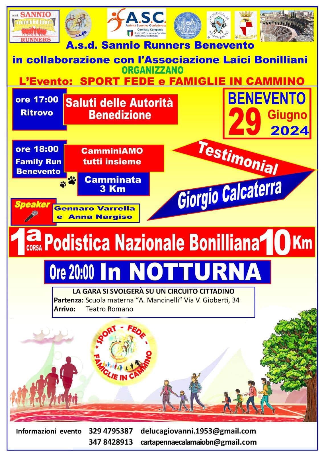 L’Associazione Laici Bonilliani in collaborazione con l’ASD Sannio Runners Benevento organizza l’evento Sport, fede e famiglie in cammino che comprende una parte agonistica, la corsa podistica nazionale bonilliana di dieci chilometri con partenza alle 19,45 dalla Scuola materna Mancinelli, via Gioberti 34 ed arrivo al Teatro Romano e una parte non agonistica rappresentata da una camminata di tre chilometri con eguale punto di partenza alle 18,00 ed arrivo al Teatro Romano. I saluti delle Autorità e la benedizione sono previsti per le 17,00.