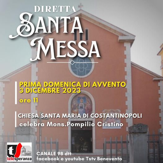 Comincia su Telesperanza il cammino di Avvento con la Santa Messa in diretta per tutte le domeniche di Avvento! Domenica 3 dicembre, alle ore 11, in diretta su canale 98 del digitale terrestre, sarà strasmessa la santa messa dalla chiesa di Santa Maria di Costantinopoli in Benevento, celebra mons. Pompilio Cristino.