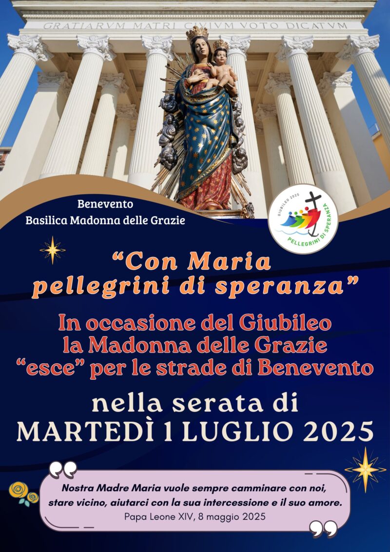 In occasione del Giubileo della Speranza, alla vigilia della sua festa, nella serata di martedì 1° luglio 2025, la Madonna delle Grazie sarà “pellegrina” per le strade di Benevento, raccogliendo le speranze di tutti, per portarle al suo Figlio Gesù. La processione terminerà con la supplica, prima che inizi la veglia notturna. Nelle prossime settimane sarà definito e comunicato il programma dettagliato. Evviva Maria, Madre della speranza.