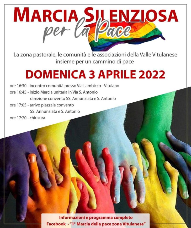 Una marcia silenziosa per la pace. Questo è il titolo del cammino per la pace in programma domenica 3 aprile alle ore 16:30 da Via Lambicco a Vitulano in direzione del Convento SS. Annunziata e S. Antonio. Un momento che vedrà unite la Zona Pastorale della Valle Vitulanese, con le Comunità e le associazioni: Campoli Monte Taburno, Castelpoto, Cautano, Foglianise, Paupisi, Tocco Caudio, Torrecuso e Vitulano, tutti insieme per dire stop a tutte le guerre.
