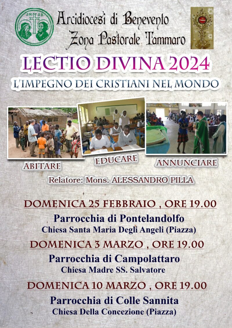 La Zona Pastorale Tammaro ha organizzato la lectio divina 2024 dal titolo: “L’impegno dei cristiani nel Mondo”. Il relatore mons. Alessandro Pilla che analizzerà tre verbi: abitare, educare, annunciare. Primo incontro, domenica 25 febbraio alle ore 19, nella parrocchia di Pontelandolfo, chiesa santa Maria degli Angeli. Secondo appuntamento, domenica 3 marzo ore 19, nella parrocchia di Campolattaro, chiesa madre SS. Salvatore. Terzo appuntamento, domenica 10 marzo alle ore 19, parrocchia di Colle Sannita, chiesa della Concezione.